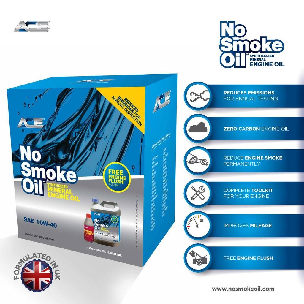 ACE NoSmokeOil SAE 10W40 passenger car and light van engine oil is manufactured from superb very high film strength lubricant bases which incorporate a specially designed and unique ‘ACEWERX’ advanced additive system which cuts engine oil smoke output on petrol and diesel engines permanently.